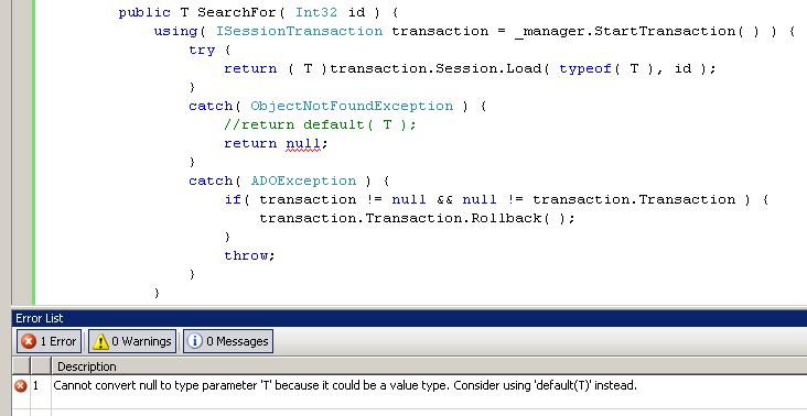 Here’s my problem… When you define a generic type it does not assume it to be either of a reference type or value type. And I do not want to force my type to be a reference type, I want it to be generic. But in a scenario where I have to return an blank or “null” value, that assumption says that the type has to be a reference type…