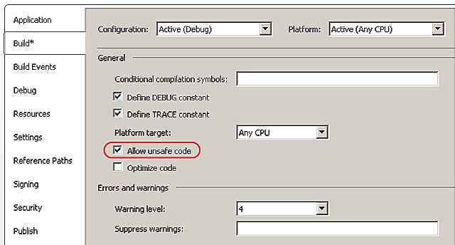 - You have to tell the C# compiler to allow unsafe code. You can do this with the /unsafe switch or check the checkbox in the project settings.