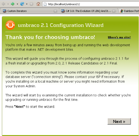 Next, I then fired up firefox and punched in http://localhost/umbraco21 into my browser, and got the Umbraco 2.1 Configuration Wizard!