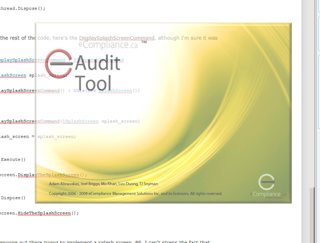 So what’s happening is the Splash screen is loaded on a background thread, while the application start up continues on the main thread. When the application start up is finished, the background thread disposes of the command that it’s executing. In this case it starts fading the splash screen away.