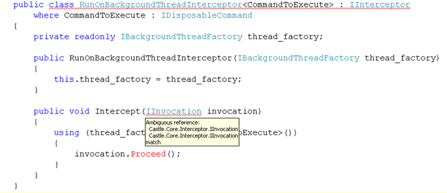So yesterday I had this idea on how to run a background thread using an interceptor, but first I needed to Grok how the castle interceptors worked. I quickly ran into a snag, it looked something like this: