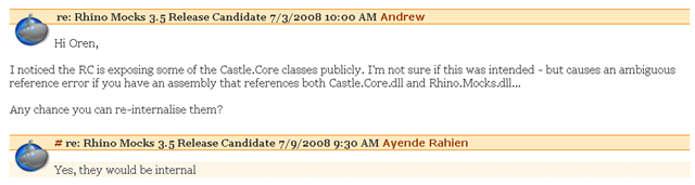 The problem is that the latest version of Rhino.Mocks hasn’t internalized the castle dependencies. So the compiler doesn’t know whether I’m referring to Castle.Core.Interceptor.IInvocation from the Castle.Core.dll or Castle.Core.Interceptor.IInvocation from Rhino.Mocks.dll.