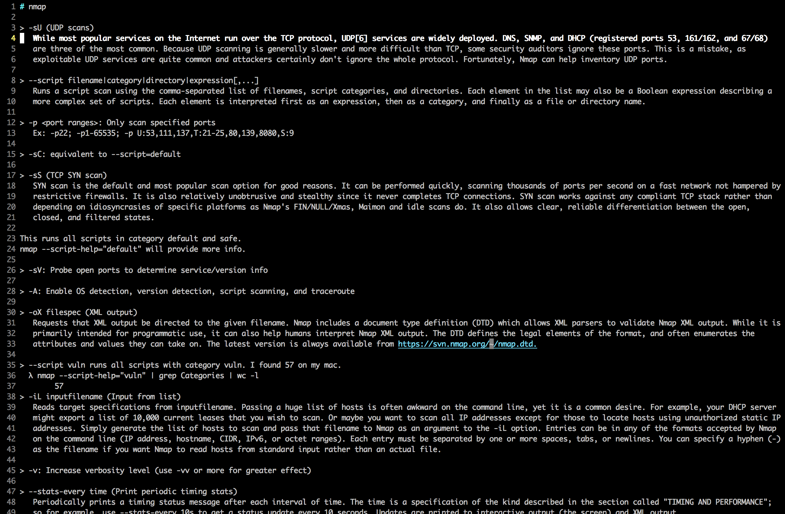 -sV: Probe open ports to determine service/version info-A: Enable OS detection, version detection, script scanning, and traceroute-oXfilespec (XML output) Requests that XML output be directed to the given filename. Nmap includes a document type definition (DTD) which allows XML parsers to validate Nmap XML output. While it is primarily intended for programmatic use, it can also help humans interpret Nmap XML output. The DTD defines the legal elements of the format, and often enumerates the attributes and values they can take on. The latest version is always available from https://svn.nmap.org/nmap/docs/nmap.dtd.--scriptvuln runs all scripts with category vuln. I found 57 on my mac.$ nmap --script-help="vuln" | grep Categories | wc -l 57-iL inputfilename(Input from list) Reads target specifications from inputfilename. Passing a huge list of hosts is often awkward on the command line, yet it is a common desire. For example, your DHCP server might export a list of 10,000 current leases that you wish to scan. Or maybe you want to scan all IP addresses except for those to locate hosts using unauthorized static IP addresses. Simply generate the list of hosts to scan and pass that filename to Nmap as an argument to the -iL option. Entries can be in any of the formats accepted by Nmap on the command line (IP address, hostname, CIDR, IPv6, or octet ranges). Each entry must be separated by one or more spaces, tabs, or newlines. You can specify a hyphen (-) as the filename if you want Nmap to read hosts from standard input rather than an actual file.-v: Increase verbosity level (use -vv or more for greater effect)--stats-every time(Print periodic timing stats) Periodically prints a timing status message after each interval of time. The time is a specification of the kind described in the section called “TIMING AND PERFORMANCE”; so for example, use –stats-every 10s to get a status update every 10 seconds. Updates are printed to interactive output (the screen) and XML output.--host-timeout <time>: Give up on target after this long--top-ports <number>: Scanmost common ports --resume <filename>: Resume an aborted scan-e <iface>: Use specified interface-T paranoid|sneaky|polite|normal|aggressive|insane(Set a timing template) While the fine-grained timing controls discussed in the previous section are powerful and effective, some people find them confusing. Moreover, choosing the appropriate values can sometimes take more time than the scan you are trying to optimize. So Nmap offers a simpler approach, with six timing templates. You can specify them with the -T option and their number (0-5) or their name. The template names are paranoid (0), sneaky (1), polite (2), normal (3), aggressive (4), and insane (5). The first two are for IDS evasion. Polite mode slows down the scan to use less bandwidth and target machine resources. Normal mode is the default and so -T3 does nothing. Aggressive mode speeds scans up by making the assumption that you are on a reasonably fast and reliable network. Finally insane mode. assumes that you are on an extraordinarily fast network or are willing to sacrifice some accuracy for speed.