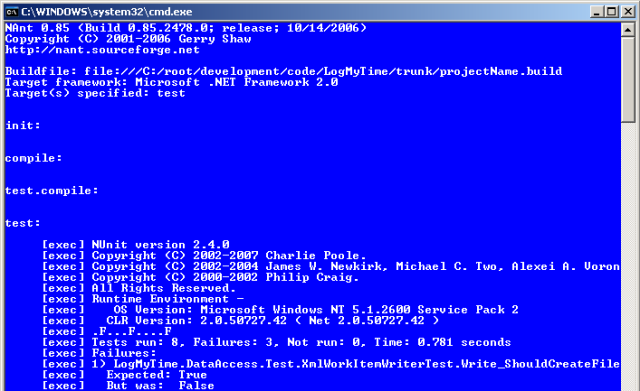 There’s a lot of cool things that you can do with nAnt, like running your tests against NUnit or another unit testing framework. Let’s pretend we already have a target called “compile” that will compile our application into an assembly into the build folder. See…