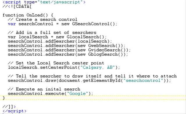 The “OnLoad” function then instantiates a “GSearchControl” object. This object is a container for the Google Search interface. Next you must add “searcher children” to the “GSearchControl” object. In the above example we have added 4 children. The local search, web search, video search and blog search “children”.