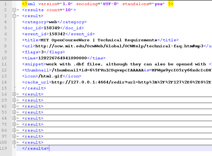 Well if you use the “&format=xml” parameter the response is an xml stream with results that look like this…